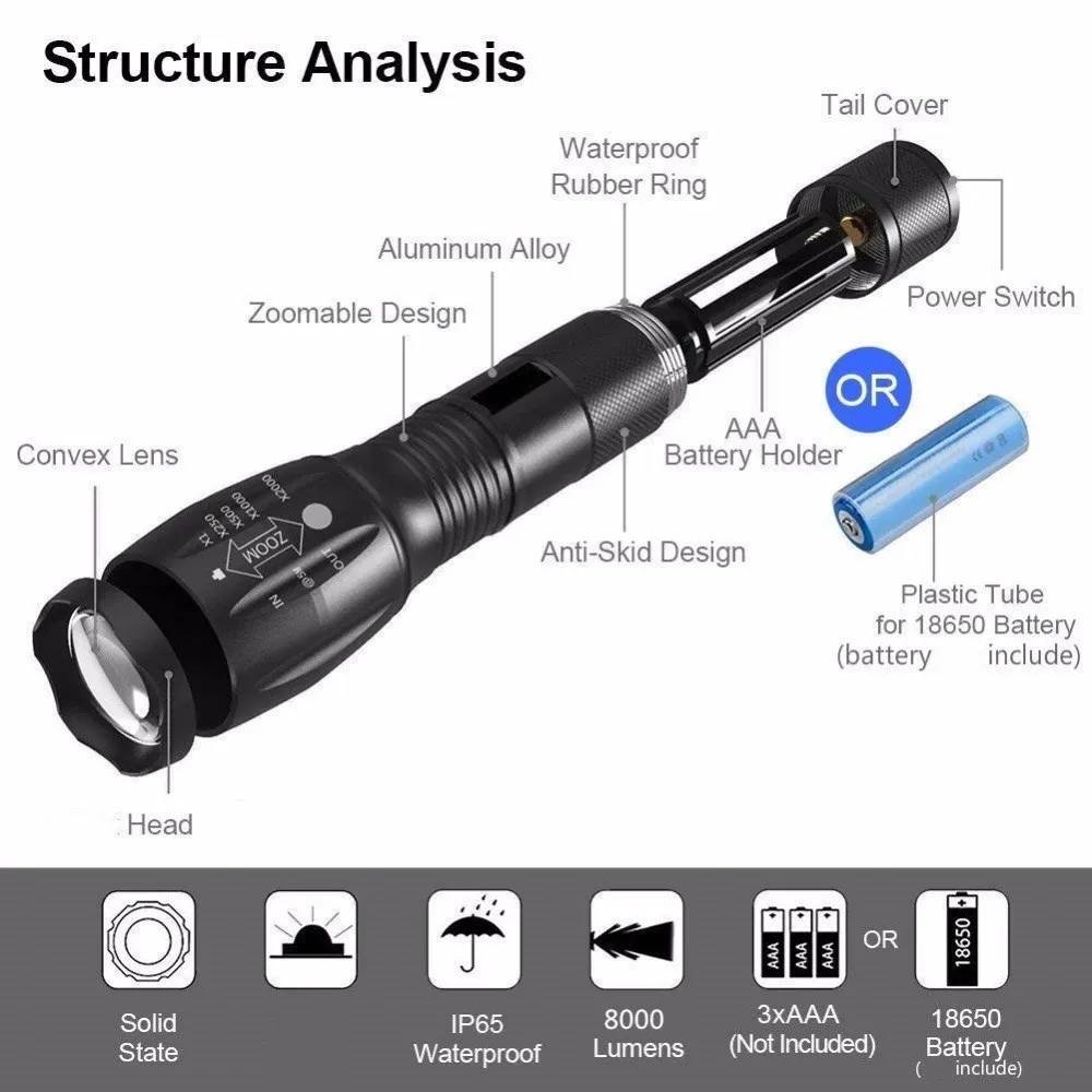 .image of Outdoor LED Tactical Flashlight Super T6/L2 Ultra Bright Focus Zoom Torch With Battery+Mini Flashli